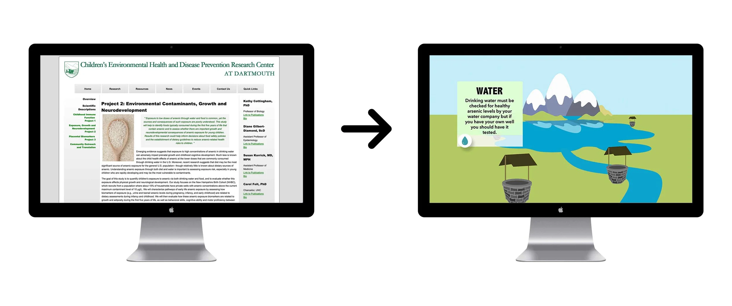 In collaboration with Dr. Carolyn Murray at the Center for Children's Environmental Health at Dartmouth Hitchcock Medical Center and a few partners at the DALI lab, we were able to turn years of research into a digestible parallax site. An interactive website that helps people understand the harmful effects of arsenic in common foods, and simple preventative measures that they can take. The website is designed in a way to make it easily accessible to all users; it includes main sections on how arsenic gets into food, tips to reduce arsenic exposure, effects of arsenic, and additional research. The design focuses on creating a friendly environment that empowers the user and motivates them to make changes in their lifestyles to reduce arsenic intake. We received great reviews from our target user group, mothers, like "it's so beautiful and fun to use!" As the project lead, I was responsible for making sure every detail was executed and any issue on the design or development side had a solution all the way to the handoff to the client. This was a fulfilling project to drive from start to finish while learning and developing my skills in Muse, Illustrator, WordPress, HTML, and CSS.